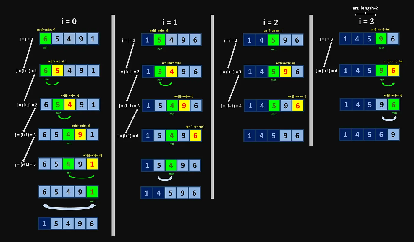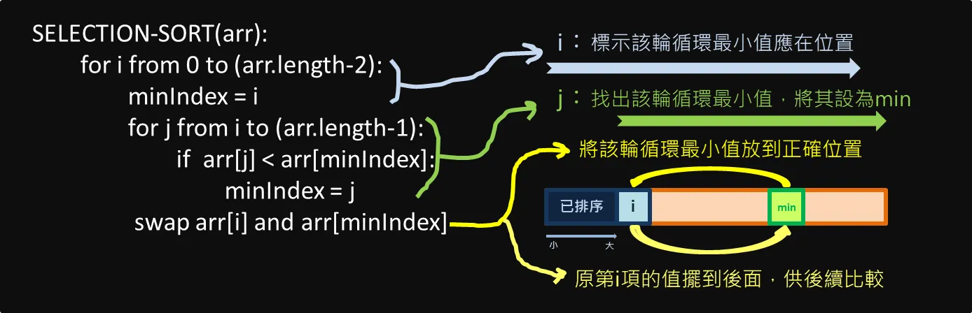 選擇排序使用雙層巢狀迴圈(nested loop),外層 j 從第 1 項走到 (arr.length-1) 項(最末項),在 j 之前的資料代表已經當過「key」;內層 i 從第 (j-1) 項開始走到第 (-1) 項,用來將資料中所有的值逐一跟「key」比較,以找出「key」的正確位置。現假設陣列中共有 (n+1) 筆資料(索引值從 0 到 n),時間複雜度分析如下: